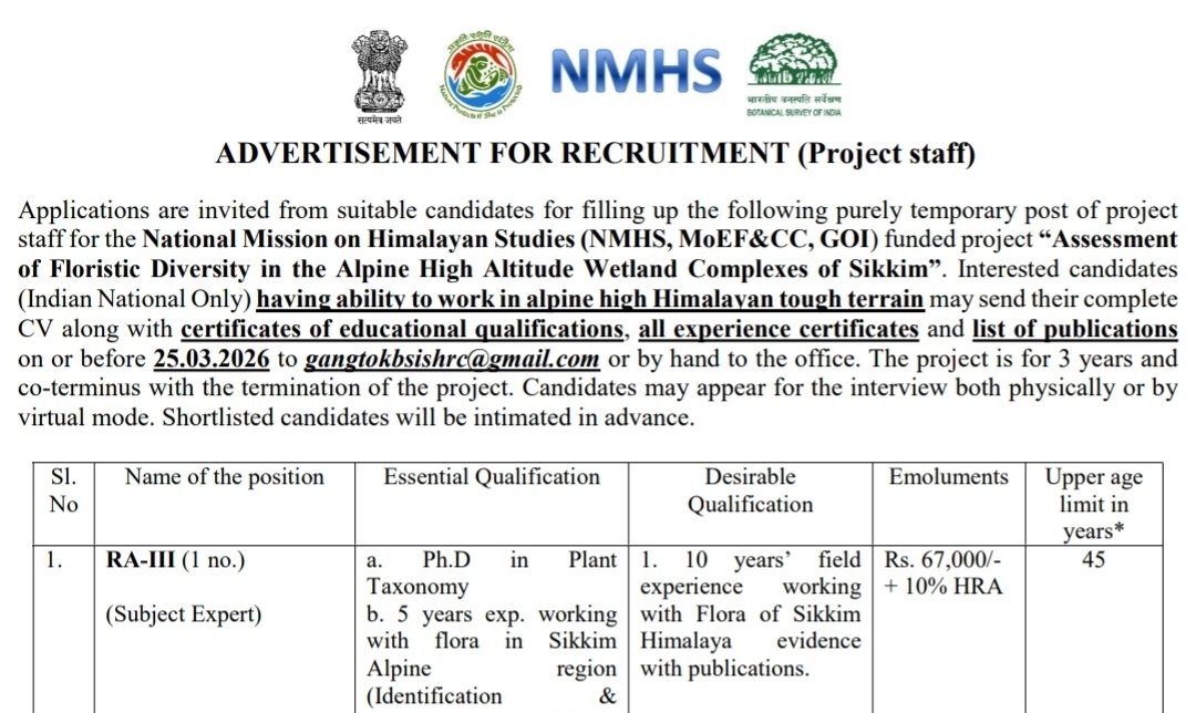 National Mission on Himalayan Studies (NMHS) ప్రభుత్వ సంస్థ నుండి మీరు apply చేసుకోవడానికి మొత్తం 05 పోస్టులతో RA, JRF, Field Assistant పోస్టుల భర్తీ కొరకు నోటిఫికేషన్ విడుదల చెయ్యడం జరిగింది.