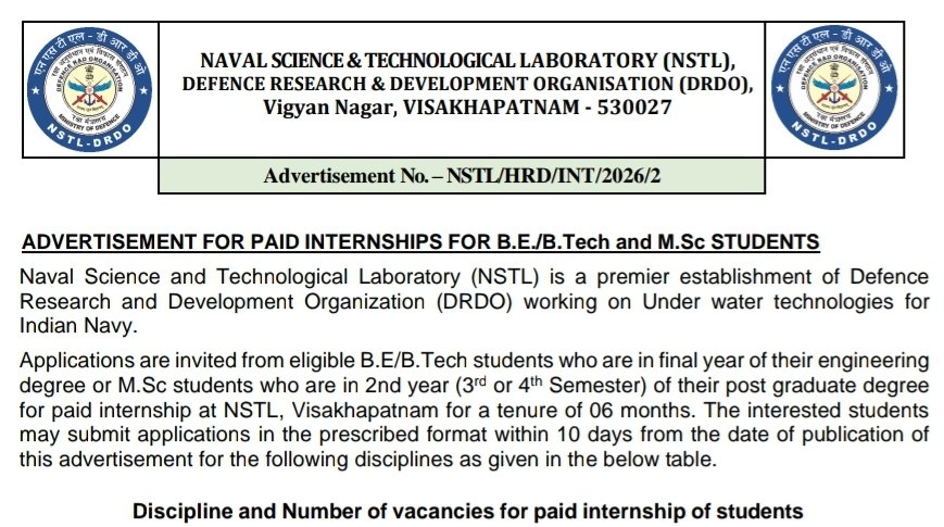 DRDO NSTL Visakhapatnam ప్రభుత్వ సంస్థ నుండి మీరు apply చేసుకోవడానికి మొత్తం 35 పోస్టులతో Internship పోస్టుల భర్తీ కొరకు నోటిఫికేషన్ విడుదల చెయ్యడం జరిగింది.